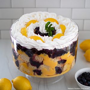 Layering Order: There’s no right or wrong way to layer the trifle, but I find that starting with a layer of cake on the bottom helps to prevent the dish from becoming soggy. And always end with a pretty topping of Whipped Cream and blueberries.