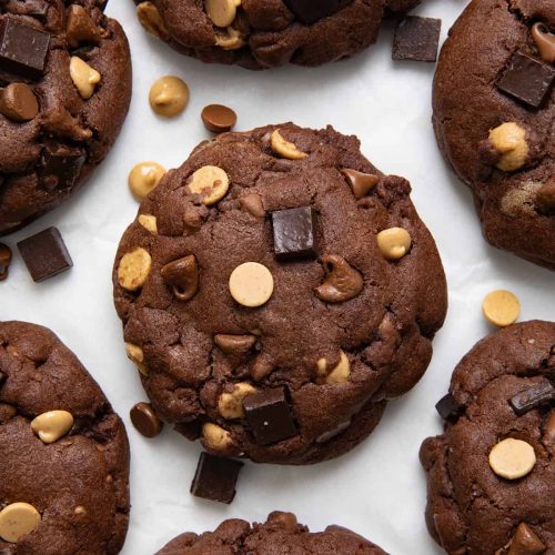 - Add the chocolate chunks, chocolate chips, and peanut butter chips. Mix just until the flour is fully incorporated.