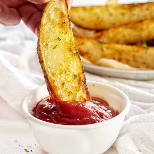 Once they’re done, carefully remove the baking sheet from the oven. Let the potato wedges rest on the baking sheet for a few minutes. This allows them to crisp up a little more and makes them easier to handle. Taste one (carefully, it’s hot!) and adjust salt and pepper if needed. Serve them hot and enjoy every single crispy, fluffy bite!