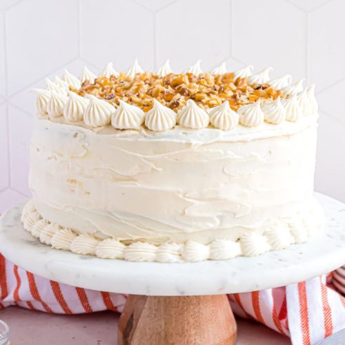 - To assemble the cake, lay one layer of pumpkin cake on a cake plate. Top with the cheesecake and the second layer of pumpkin cake. Frost the sides and top with a thin layer of frosting to apply a crumb coat. Refrigerate for 30 minutes to an hour. Remove from the refrigerator and frost the remaining cake, decorating using a tip if desired. Sprinkle pecans on top of the cake and drizzle with caramel sauce. Keep the cake covered in the refrigerator until ready to eat. Remove and allow to sit about 15 minutes before slicing. ENJOY!