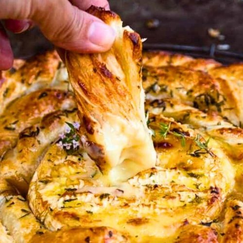 - Carefully transfer onto a serving platter using the parchment paper. Serve immediately by tearing the puff pastry and dipping into the melty cheese.