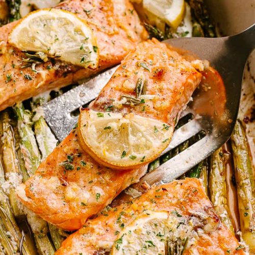 - Remove from the oven. Squeeze lemon juice over the salmon, garnish with fresh parsley, and serve.