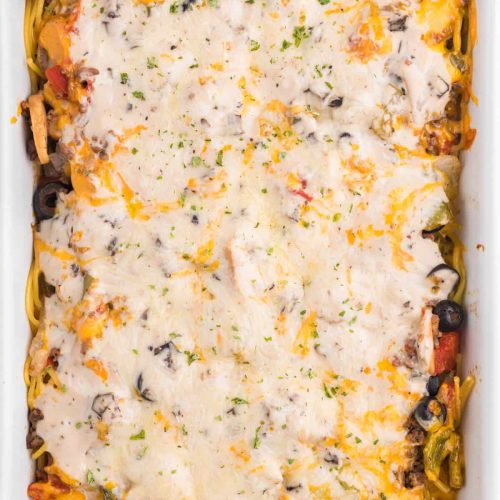 This is probably the hardest part: letting it rest! Once it comes out of the oven, let the baked spaghetti casserole sit for at least 10-15 minutes before slicing. This allows everything to set up a bit, so it doesn’t fall apart when you cut into it. While it’s resting, the flavors continue to meld, and it becomes even more delicious. The “glaze” here is essentially the melted cheese and sauce that will coat each slice.