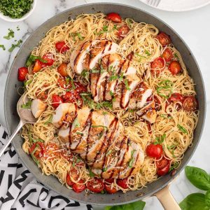 Return hot pasta to the pot or a large bowl. Add the bruschetta mixture and chicken slices, gently toss to combine. Add reserved pasta water gradually to loosen and help all the flavors blend into a silky yet light sauce.