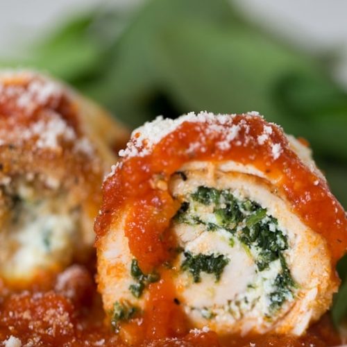 Tender chicken cutlets stuffed with spinach and cheese, rolled and baked in a savory tomato sauce.