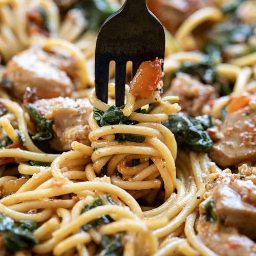 Flavorful chicken and fresh spinach tossed with spaghetti in a tangy tomato sauce.