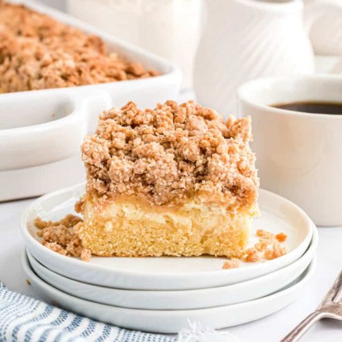 Thick Cream Cheese Coffee Cake features a moist, tender crumb with a luscious layer of cream cheese filling topped with a crunchy cinnamon streusel. Perfect for breakfast or dessert!
