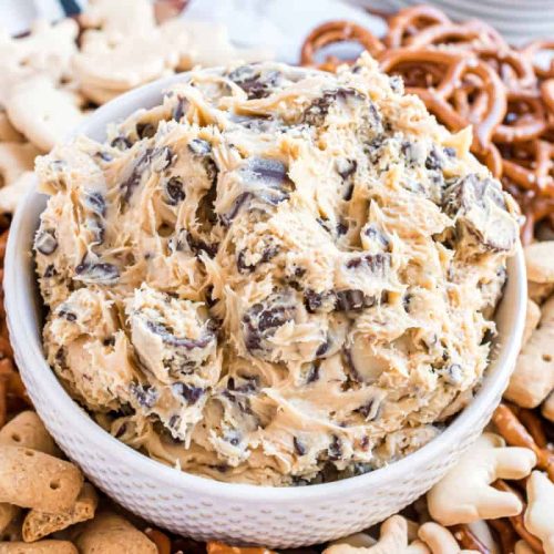 Scoop the peanut butter cookie dip into a serving bowl. Arrange your favorite dippers around it. It’s best served at room temperature or slightly chilled, but not cold, as that can make the peanut butter seize up a bit. Enjoy immediately!