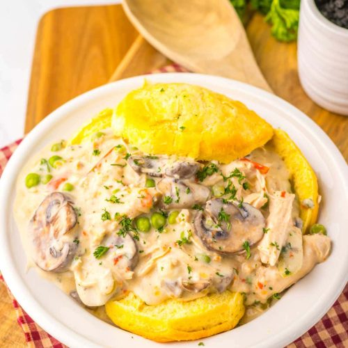 - Add the peas, mushrooms and cream 30 minutes before serving.