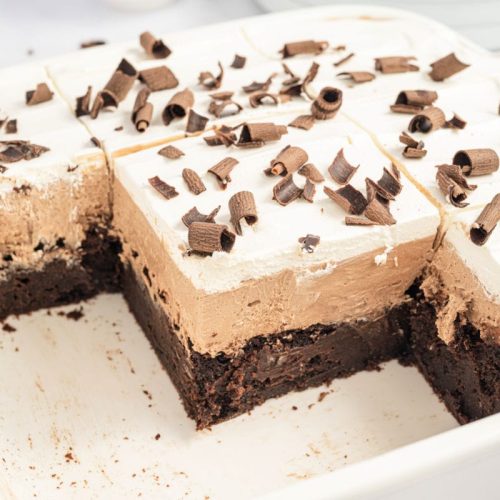 - Pour the French silk filling over the cooled brownie base. Refrigerate for at least 2 hours or until set.