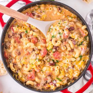 A hearty one pot chili mac with beef, pasta, and melty cheese, ready in about 30 minutes.