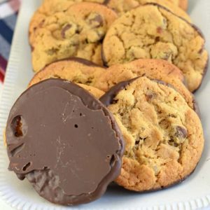 - Melt the chocolate bark according to package directions. Dip the bottoms of cooled cookies in melted chocolate and place chocolate side down on parchment paper to set, about 15 minutes. Store covered.