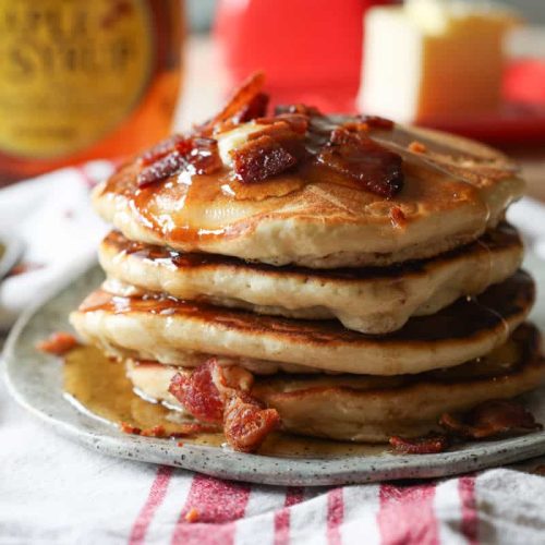 Fluffy buttermilk pancakes sweetened with brown sugar and maple syrup, studded with crispy bits of bacon for a perfect breakfast treat.