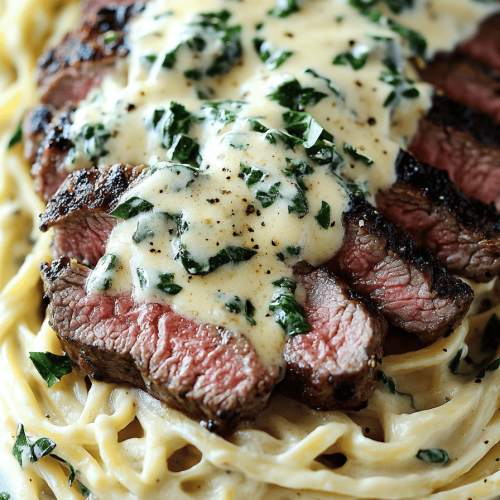 - Slice the steak and serve over the Gorgonzola Alfredo sauce.