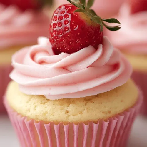 - Frost the cooled cupcakes with the strawberry frosting.