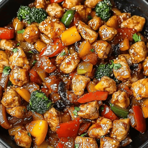Pour the prepared sauce over the chicken and vegetables. Stir well to coat and cook for another 1-2 minutes, until the sauce has thickened.