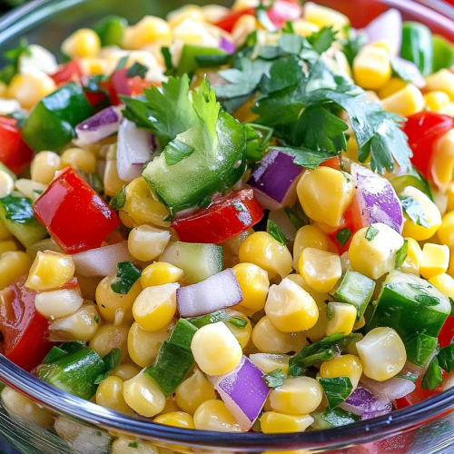Bright and refreshing corn salad with fresh vegetables, feta, and a zesty lemon-olive dressing.