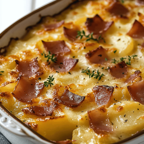 Repeat layers: potatoes, cream, and cheese. End with a layer of cheese.