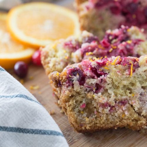 Toss the cranberries with a tablespoon of the dry flour mixture or sugar if you want to tone down the tartness. This little step keeps them from sinking to the bottom of the loaf and spreading evenly through every slice.